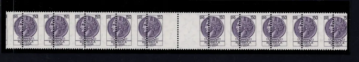 MNH - Vollgummi - Syrakus Lire 150 Nr. 1083A Streifen von zehn Exemplaren mit stark verschobener vertikaler Verzahnung, aufgrund der starken Verschiebung hat der Blattzwischenraum in der Mitte - neuer perfekter Vollgummi - Ungewöhnlich Cod. 3292/WEB