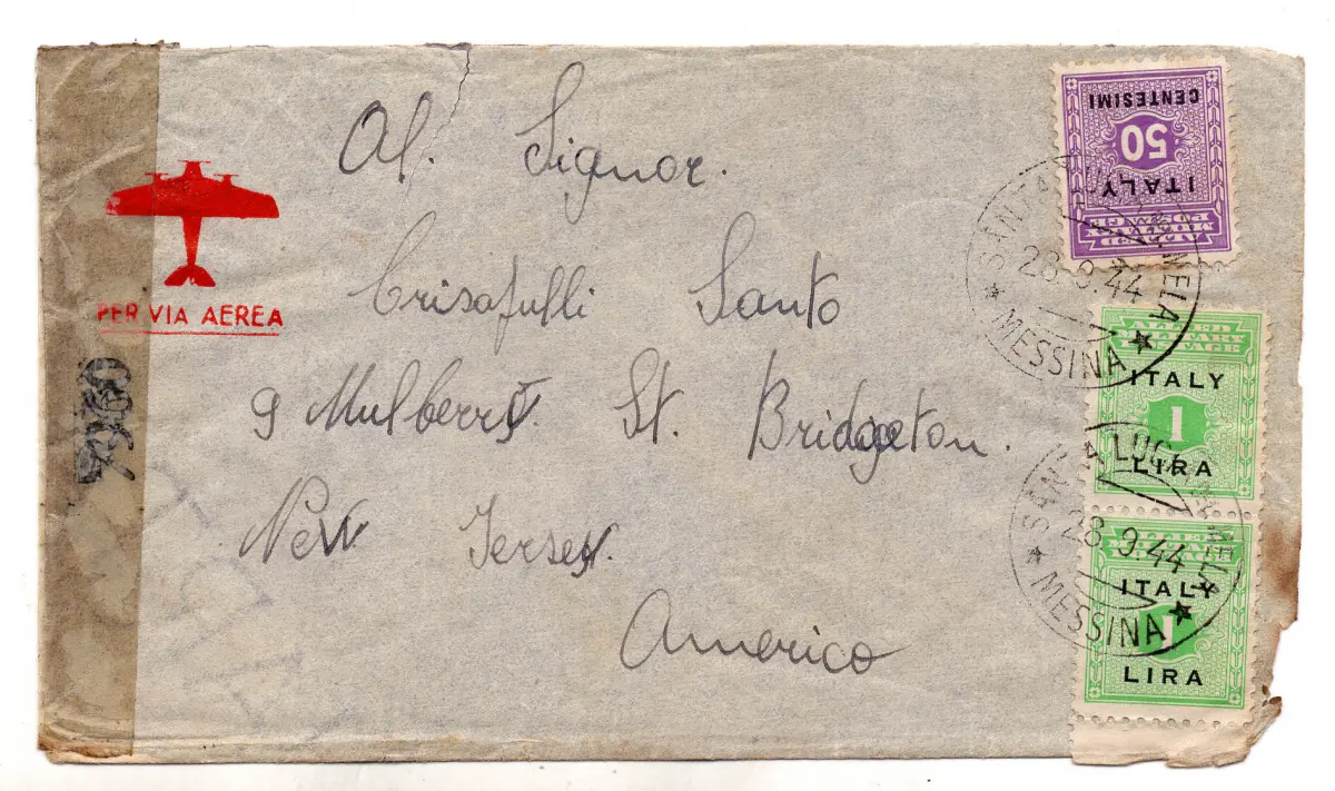 Sizilien Occ. Alliierte - Lire 1 Paar b. von f. auf Umschlag von S. Lucia del Melo - Sizilien Occ. Alliierte - Lire 1 Nr. 6 Paar b. von f. + Ergänzung Nr. 4 auf Umschlag von St. Lucia del Melo für die USA am 28.8.44 - seitlich Zensurband - Ungewöhnlich im Auslandstarif Nr. 1168/20