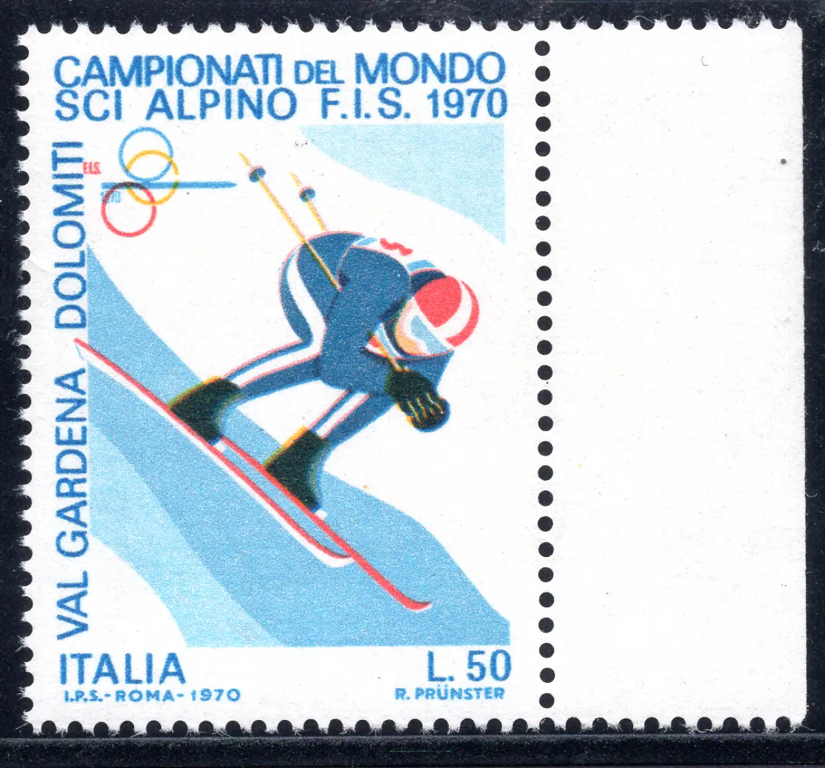 ** MNH - Ski Alpino Lire 50 Nr. 1116 mit nach rechts verschobenem Blaudruck (sichtbar von der Position des olympischen Rings) - Ungewöhnlich Cod. 627/8