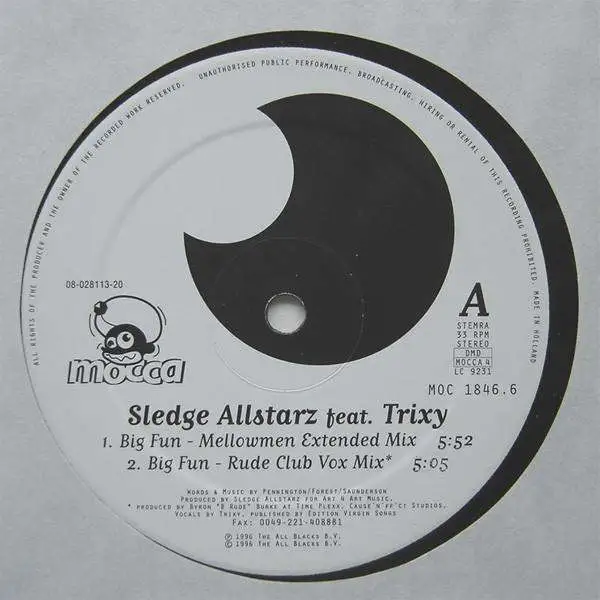 12" Maxi Sledge Allstarz feat. Trixy - Big Fun, Einheitscover der Plattenfirma; Cover beschriftet, Zustand Platte M- Hülle VG+; Made in Netherlands 1996 Mocca MOC 1846.6, Tracks Mellow Extended Mix 5:52, Rude Club Vox Mix 5:05, Mellow Dub 5:52, Great Funk 5:50