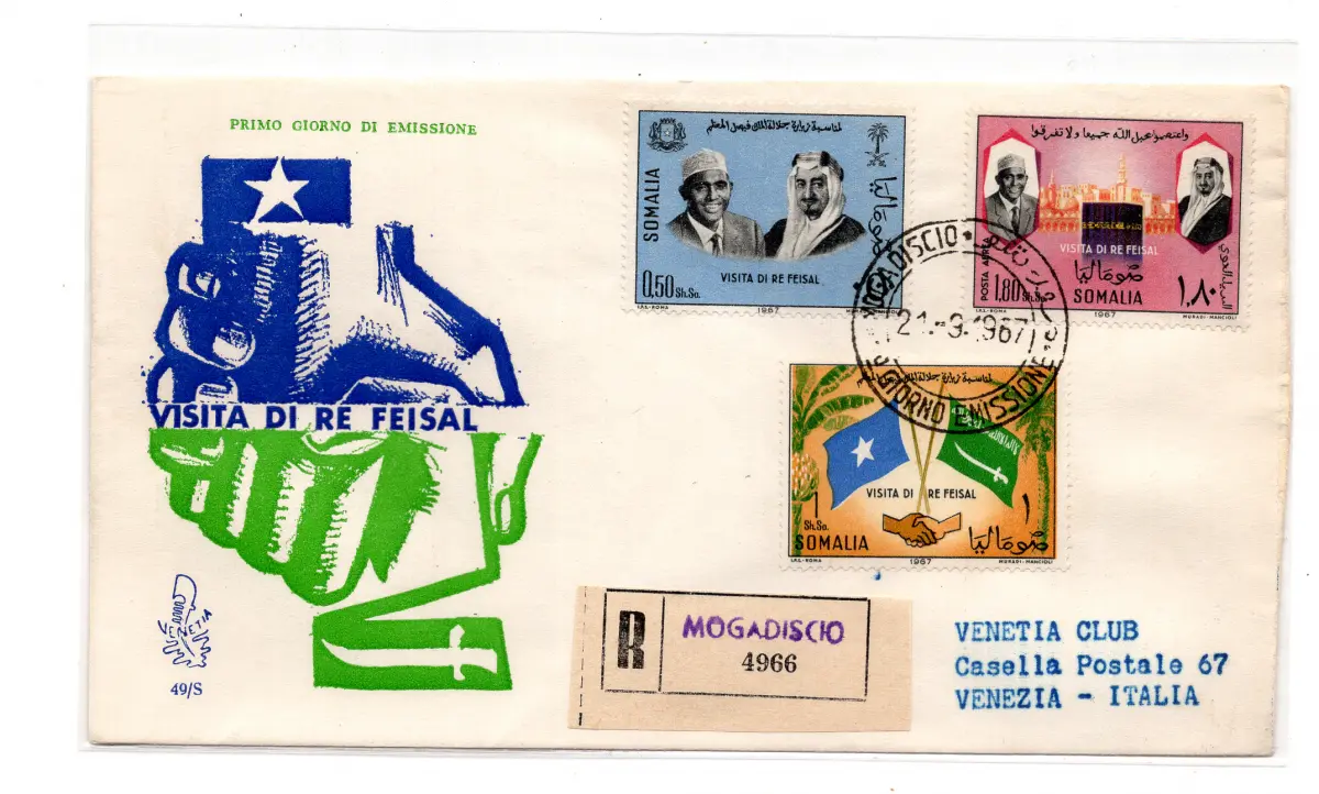 Somalia AFIS FDC Venetia 1967 König Feisal reiste Racc. für Italien Somalia AFIS 1967 König Feisal auf FDC Umschlag gereist Racc. für Italien mit Annullierung der Ankunft - Abreise - Abreise Stornierung Mogadischu Cod. 1666/Venedig