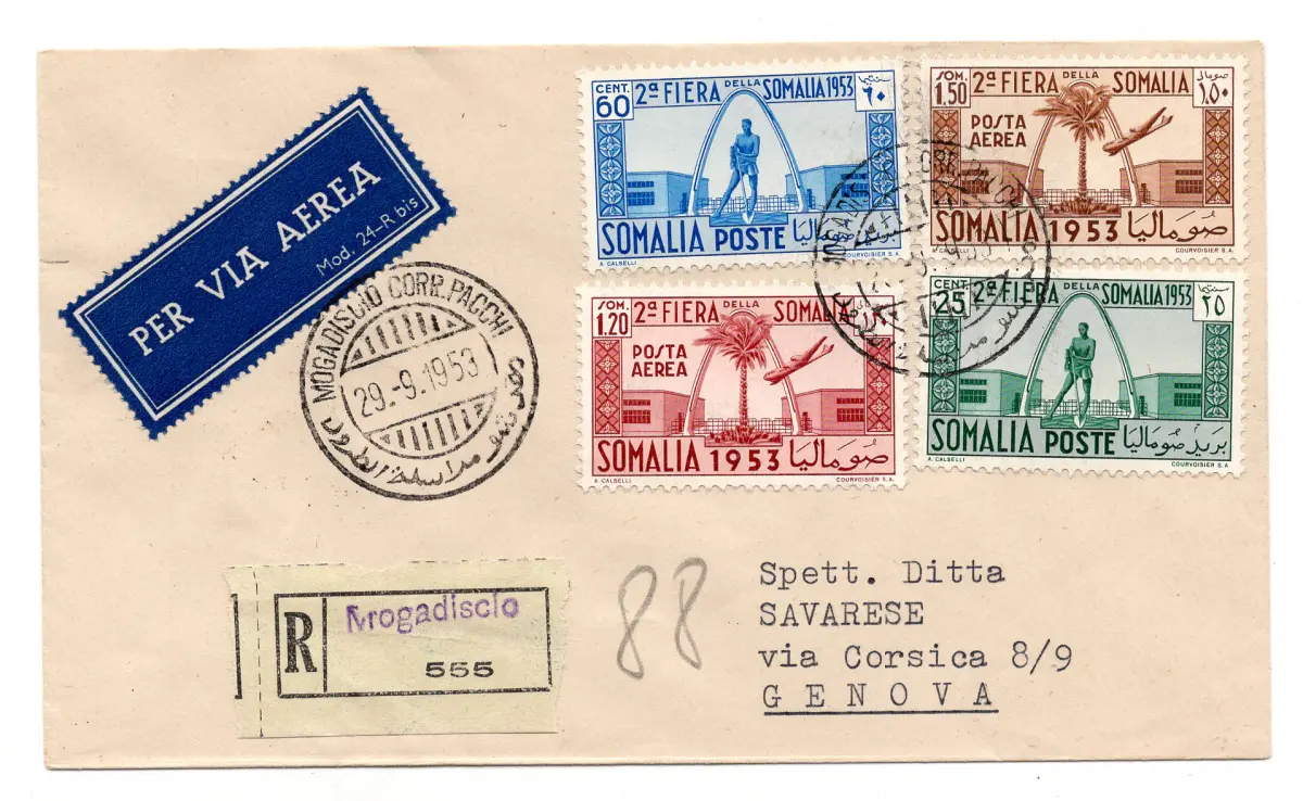 Umschlag - Somalia Afis - 2. Messe Somalia Nr. 19/20 + P.A. n. 16/17 Serie auf Umschlag Racc. auf dem Luftweg nach Genua am 29.9.53 Cod. 1084/17