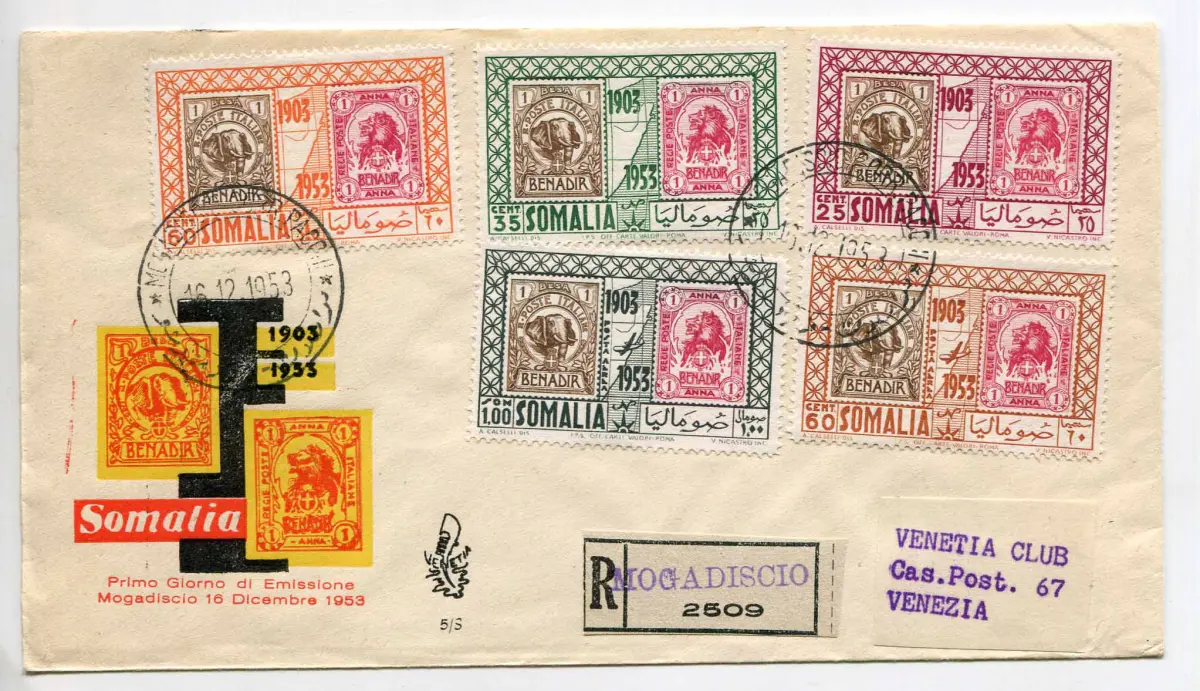Somalia Afis - 50. Briefmarken Somalia Umschlag Venetia Umschlag - Somalia Afis - 50. Briefmarken Somalia Nr. 21/23 + P.A. Serie auf Umschlag (Nr. 5/S) gereist Racc. mit ann. Ankunft - Uncommon Cod. 523/14