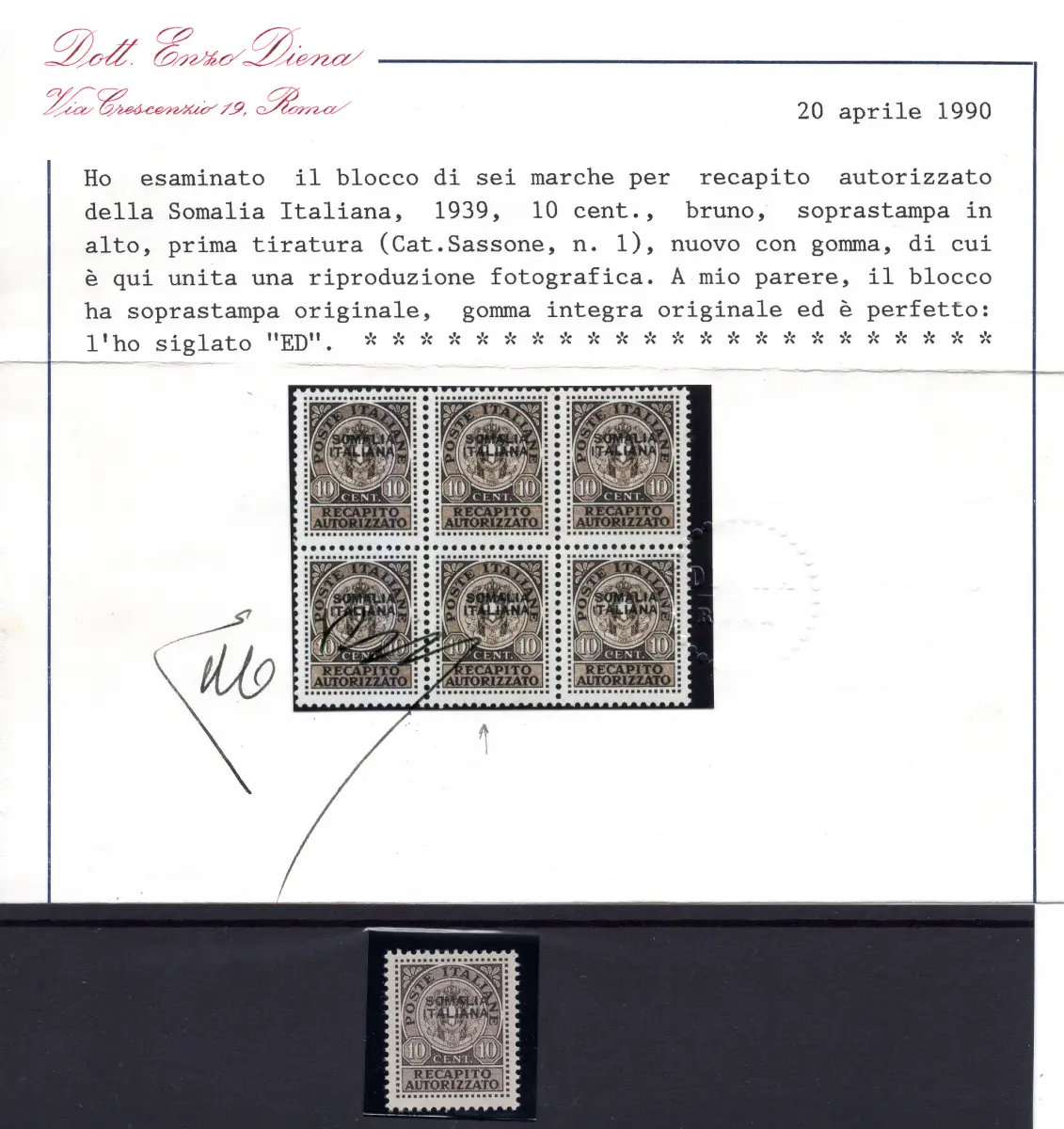 MNH - Gomma Integra - - Somalia It. - Autorisierte Zustellung Cent. 10 braun Nr. 1 farbloser Gummi - sehr gut sehr frisch, gut zentriert signiert ED - im beigefügten Kopie zert. aus Herkunft - Kat. euro 300 Cod.1083/182
