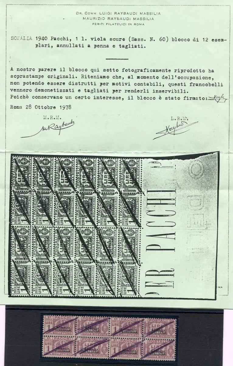Somalia It. - Postpakete 1 Lira Viertel ungültig Vollgummi MNH - Somalia It. - Postpakete 1 Lira Nr. 60 Viertel ungültig durch zahlreiche Federstriche an allen Abschnitten und durch Rasierschnitte an jedem horizontalen Paar - nach Ansicht der Raybaudi-Studie (beigefügte beglaubigte Kopie eines Zwölfblocks) ..Wir sind der Meinung, dass diese Briefmarken zum Zeitpunkt der Besetzung aus buchhalterischen Gründen nicht zerstört werden konnten, demonetarisiert und geschnitten wurden, um sie unbrauchbar zu machen - Interessanter Anlass Cod. 967/15