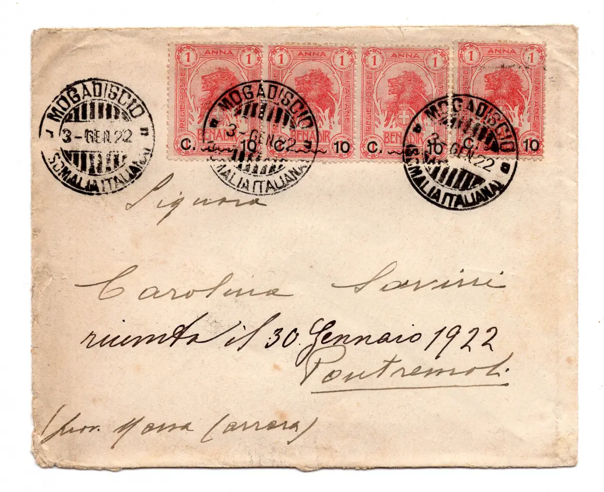 Somalia It. - Provisorische Löwen Cent. 10 von 1 vier Exemplaren auf Umschlag aus Mogadischu - Somalia It. - Provisorische Löwen Cent. 10 von 1 Nr. 12 vier Exemplare auf Umschlag von Mogadischu nach Pontremoli am 3.1.22 - Ungewöhnlich - Kat. 600 n. 1269/20