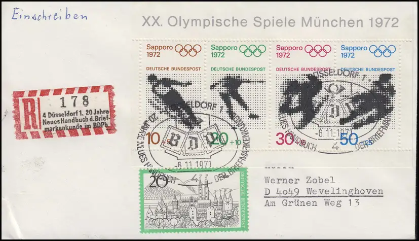Einschreiben mit Block 6 Olympia München 1972 iin Mischfrankatur mit Sonder-R-Zettel und passendem Sonderstempel Düsseldorf anläßlich "20 Jahre Neues Handbuch der Briefmarkenkunde im BdPH".
