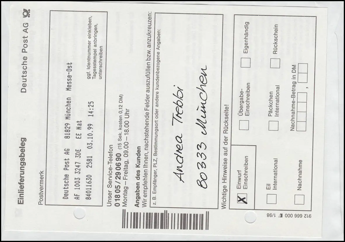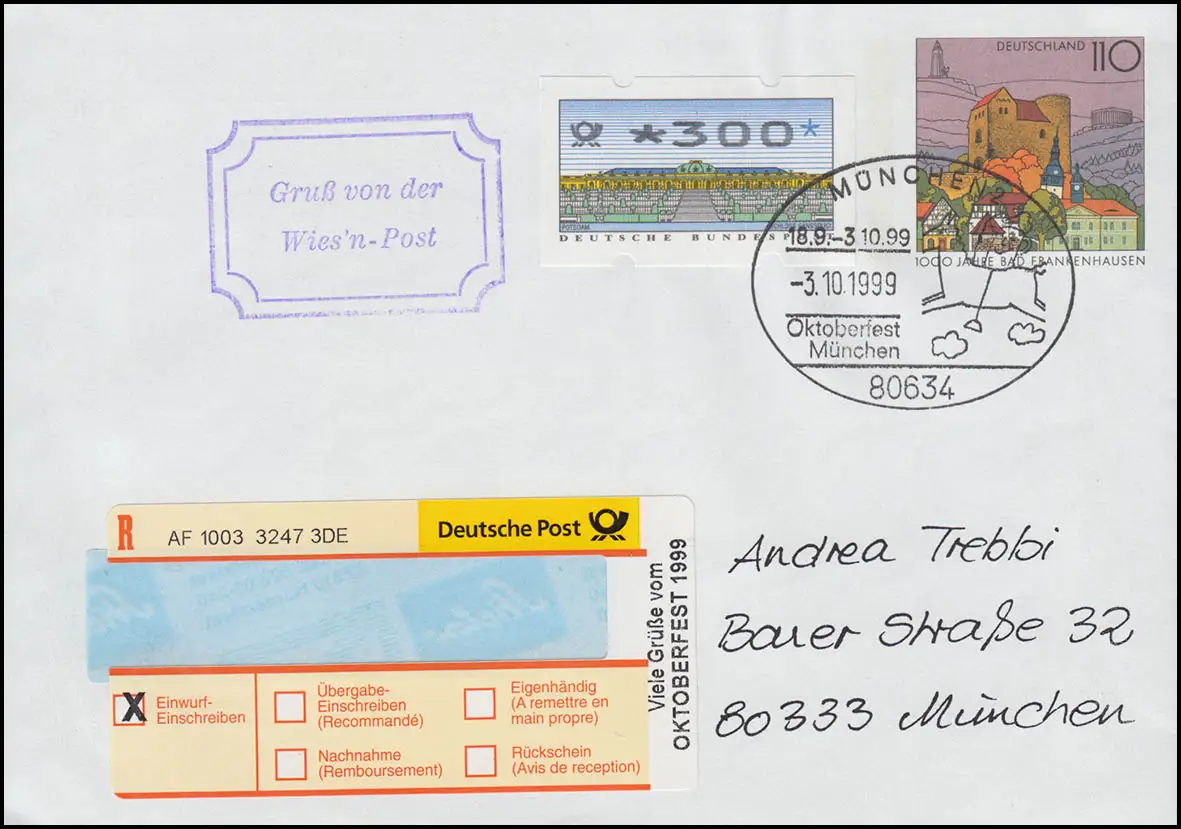 Sonder-Einschreibe-Zettel "Viele Grüße vom OKTOBERFEST 1999", portogerechte ATM-Einzelfrankatur auf Fernbrief per Einwurfeinschreiben, mit Sonderstempel "MÜNCHEN Oktoberfest 3.10.1999", Premium-Label mit vorgedrucktem Kreuz "Einwurf-Einschreiben", EPOS-Einlieferungsbeleg, violetter Cachet-Stempel "Gruß von der Wies'n-Post", codiert