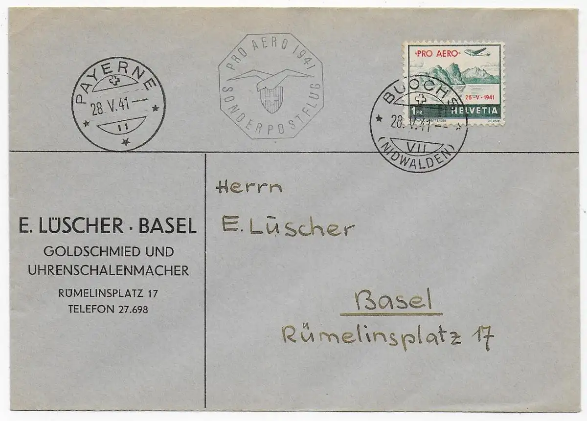 Sonderpostflug Pro Aero 1941 von Buchs nach Basel, Goldschmied, Uhrmacher