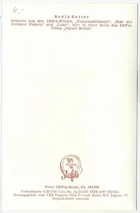 Sonja Sutter Verlag: VEB Progress Film Vertrieb Berlin W 8, Postkarte ohne Einteilung Erhaltung: I-II Karte wird in K