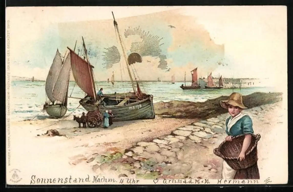 Sonnenschein-AK Fischerboot am Strand mit Fischerin