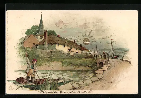 Sonnenschein-AK Junge mit seinem Boot an einer Brücke in den kleinen Ort, der Kirchturm im Hintergrund