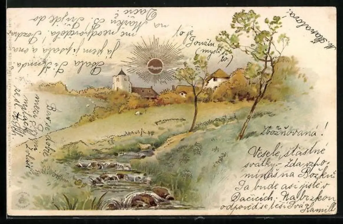 Sonnenschein-AK Ortschaft mit Kirche, Flusspartie, Goldene Sonne