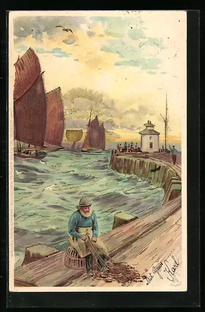 Sonnenschein-AK Segelschiffe auf dem Wasser und Fischer mit Netz am Ufer