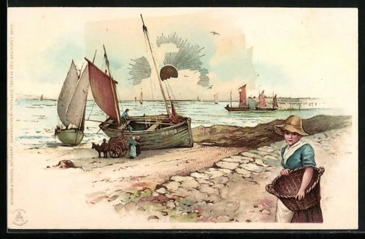 Sonnenschein-AK Strandpartie mit Sgelschiff / Fischerboot