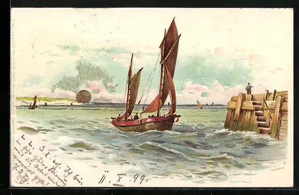 Sonnenschein-Lithographie Segelboot fährt aufs Meer hinaus
