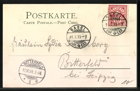 Personenbezogene Daten auf der Rückseite der Karte wurden durch blauen Textmarker unkenntlich gemacht. Die blauen Stellen sind auf die Vorderseite durchgeweicht und wirken sich negativ auf das Postkartenfoto aus