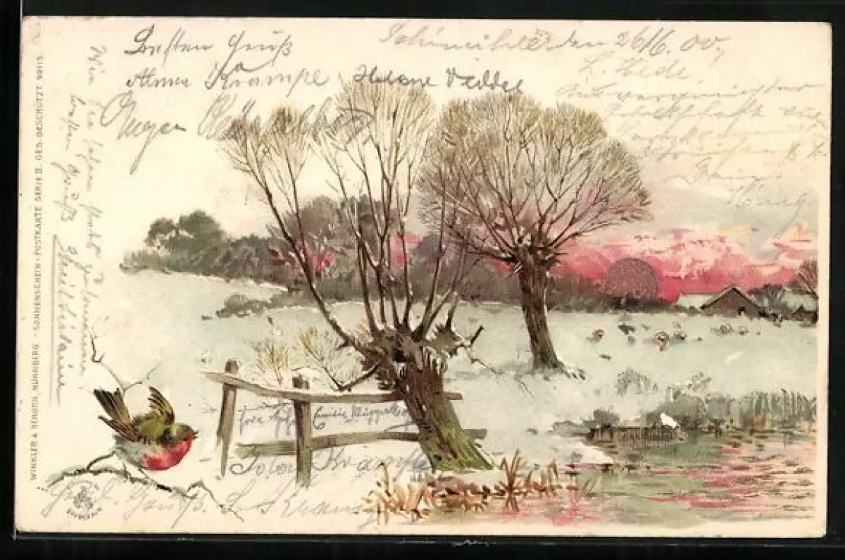 Sonnenschein-Lithographie Winteridyll mit Rotkehlchen