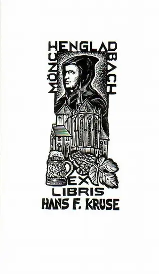 Darstellung: Mann mit Mönchskapuze oberhalb des Domes von Möchengladbach.