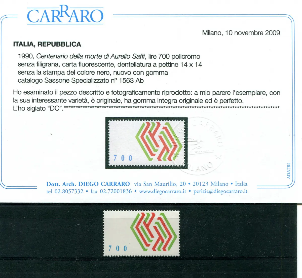 Vollgummi - 1990 Aurelio Saffi - schönes Exemplar ohne Schwarzdruck, daher ohne alle Beschriftungen aber mit Nennwert 700 - Katalog Euro 3.000,00 - Carraro Zertifikat - - Nr. 111/WEB