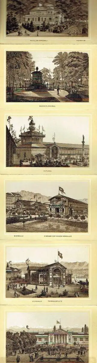 guter Zustand, Gebrauchs- und Alterungsspuren: Einbandecken und -kanten teils mehr oder weniger abgenutzt - der lose Leporello wurde fachgerecht wieder eingeklebt, dabei das erste Scharnier erneuert - ein Scharnier ca. 1 cm eingerissen - Bildtafeln sauber und ordentlich, nur die letzte hat einen verfärbten senkrechten Rand, wo die letzte Kante schon mal vor längerer Zeit stabilisiert (hinterklebt) wurde, 9 einfarbige Ansichten - Haupteingang - Hauptportal - Alpenclub - Forst, Jagd und Fischerei - Pavillon Sprüngli - Aquarium - Gessner-Denkmal - Rotunda - Bierhalle - Eingang zur Maschinenhalle - Festhalle - Tonhalleplatz - Palmengarten - Kunsthalle, Pappband, ca. 12 x 8, kleiner Leporello-Bildband mit 9 aneinander hängenden Bildern, das erste im Deckel eingeklebt