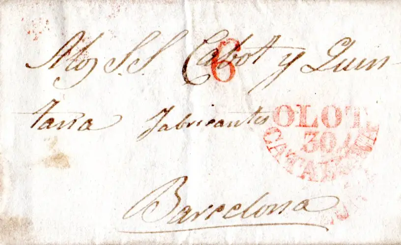 Spanien 1842, Brief m. rotem Stpl. OLOT CATALUNA n. Barcelona.