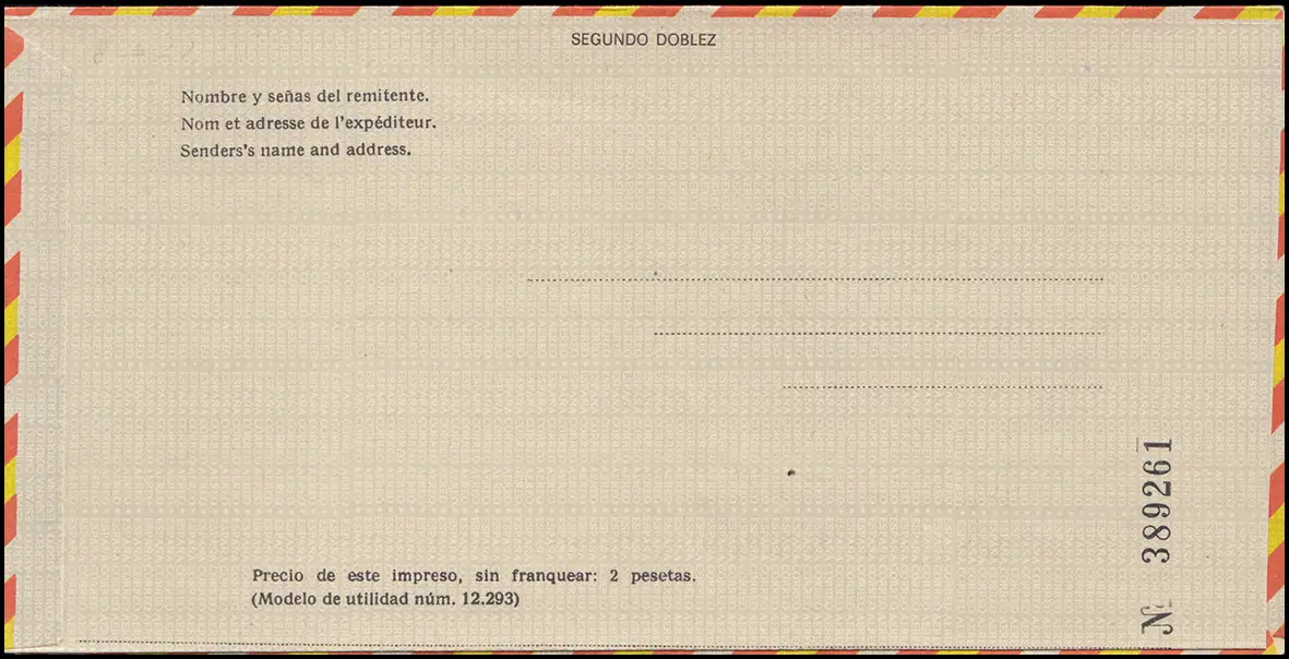 Luftpost-Freistempel auf Aerogramme, "Papierpreis 2 pesetas" auf der Rückseite