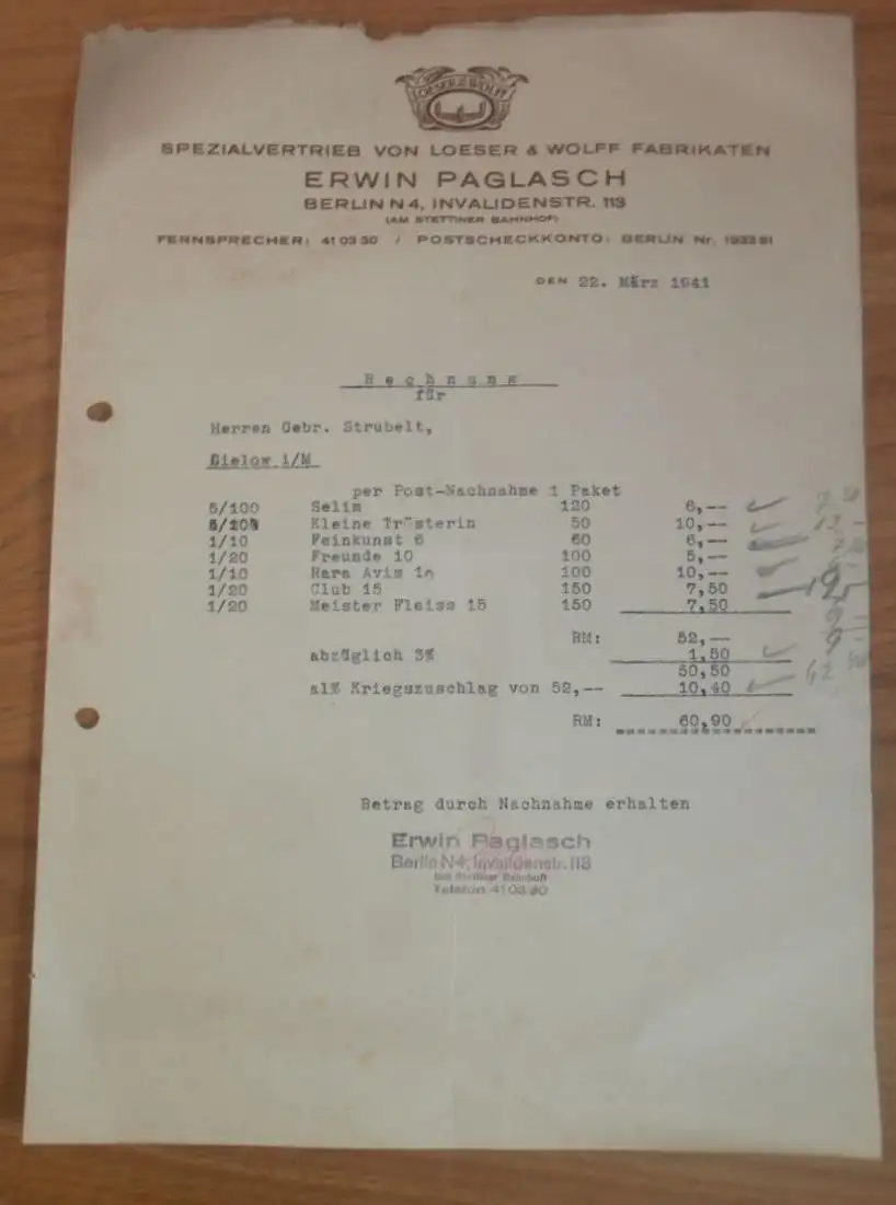 Spezialvertrieb - Erwin Paglasch in Berlin , 1941 , Reklame , altes Dokument !!