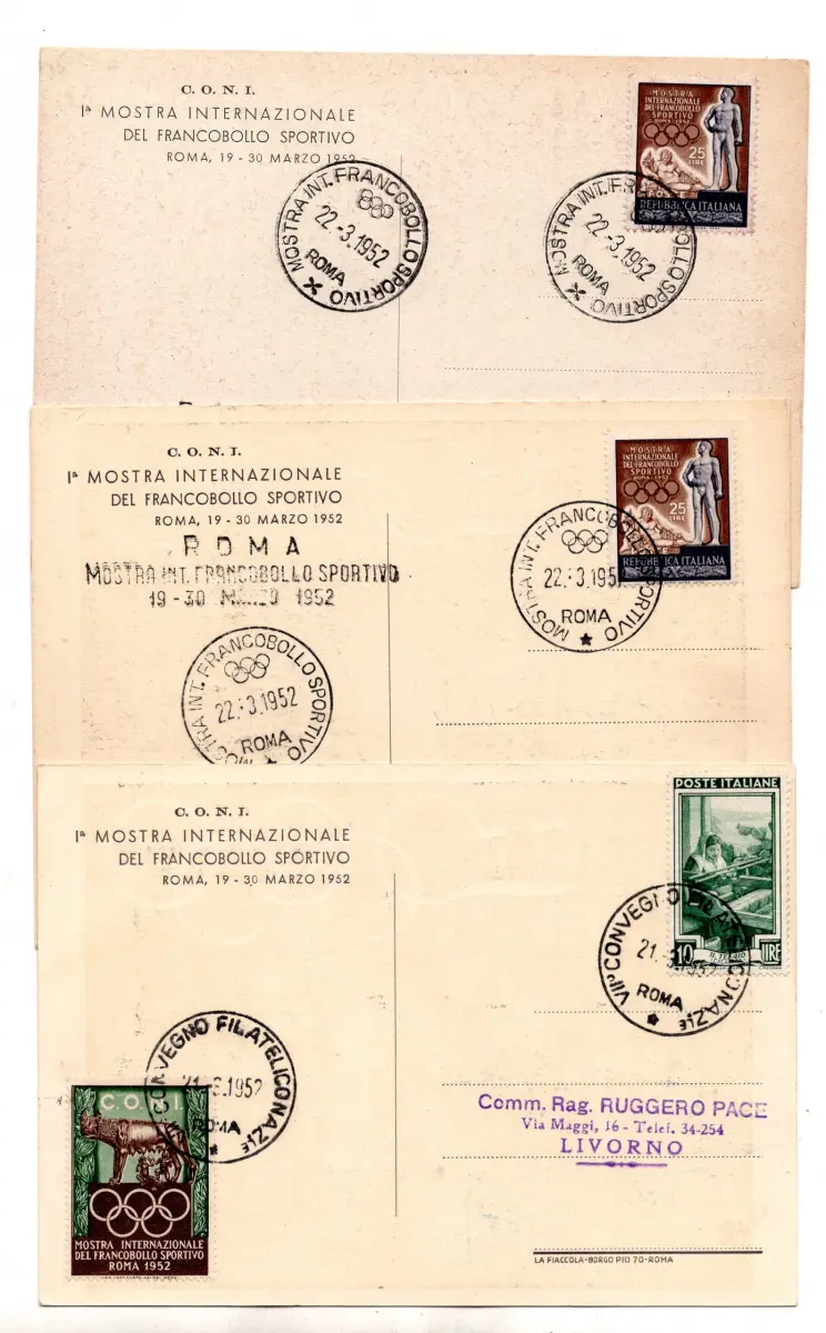 - Sport - Ausstellung der Sportmarke zwei verschiedene frankierte offizielle Postkarten mit der Nr. 684 + eine Postkarte mit Hernophilus des CONI - Ann. specials - Schönes Set Nr.687/19