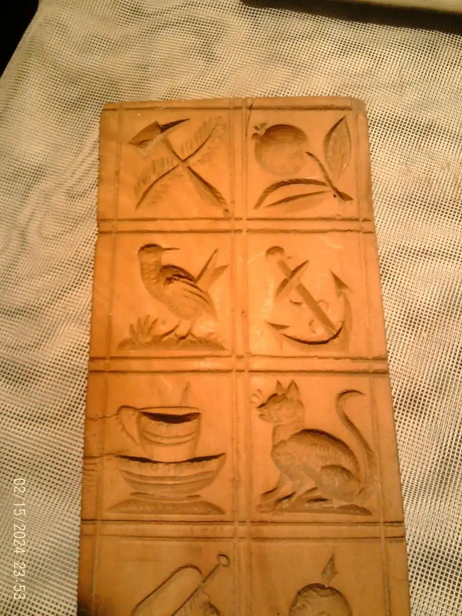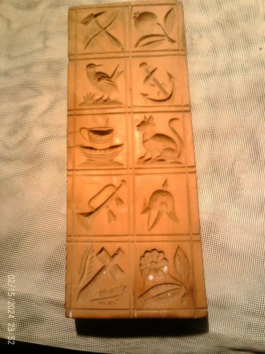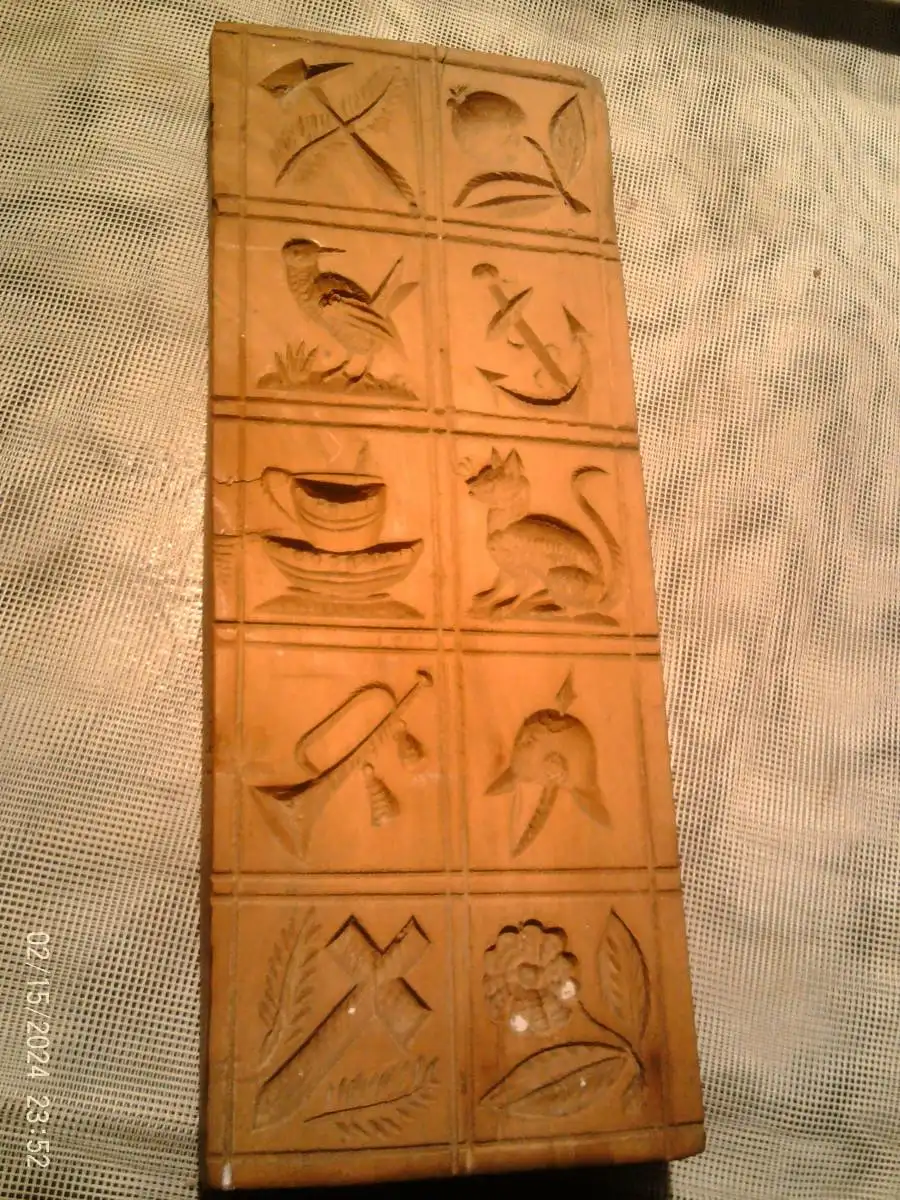 biete:Springerle Modell 10 Motive um 1860 besonders seltene Motivwahl Paradehelm Trompete Anker Kirschbaum 8,3x 22x 2,4 cm