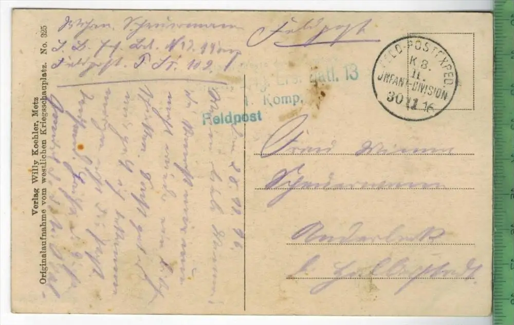 St. Benoit-en Woèvre-1916-, Verlag : Willy Koehler, Metz, FELD- POSTKARTE ohne Frankatur, mit Stempel 30.11.16, Erhaltung: I-II, Karte wird in Klarsichthülle verschickt.