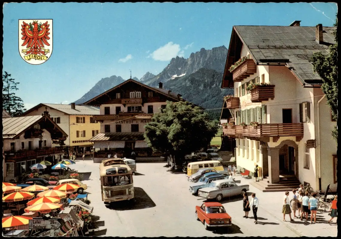 St. Johann in Tirol Ortsansicht, Autos Bus, Gastwirtschaft Gasthof 1969