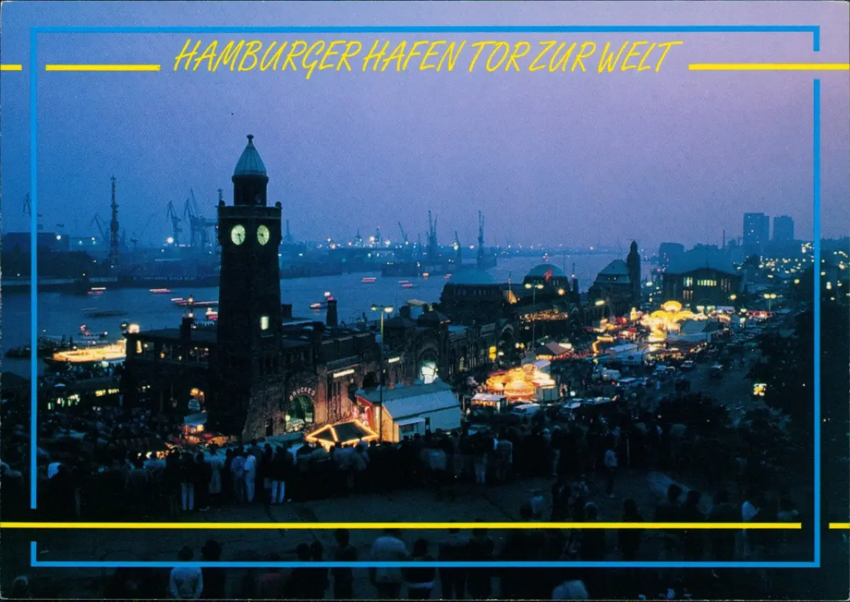 St. Pauli-Hamburg Hafen mit Landungsbrücken bei Dämmerung 1980