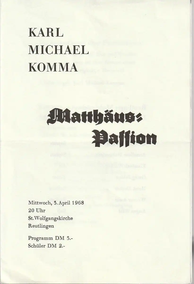 St. Wolfgangskirche Reutlingen: Programmheft Karl Michael Komma MATTÄUS-PASSION 5. April 1968 St. Wolfgangskirche Reutlingen.