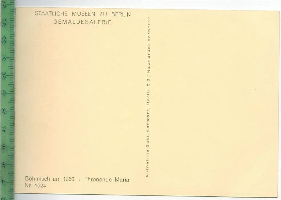 Staatliche Museen zu Berlin, Böhmisch um 1520/Thronende Maria, Gemäldegalerie Nr. 1624, Verlag: Gustt. Schwarz, Berlin, – Postkarte unbenutzte Karte, Maße: 15 x10,5 cm, Erhaltung:I-II, Karte wird in Klarsichthülle verschickt.(H)