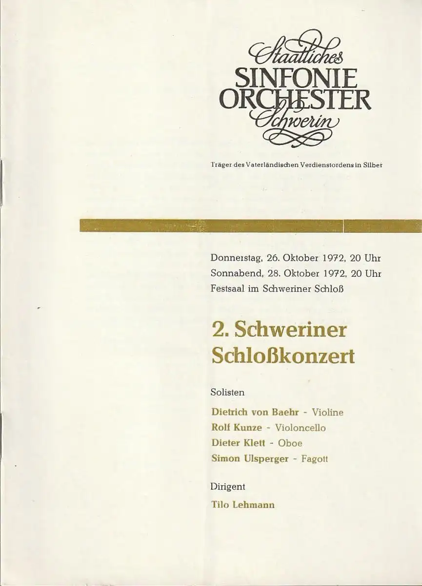 Staatliches Sinfonieorchester Schwerin, Walter König, Dieter Klett: Programmheft 2. Schweriner Schloßkonzert 26. Oktober 1972.