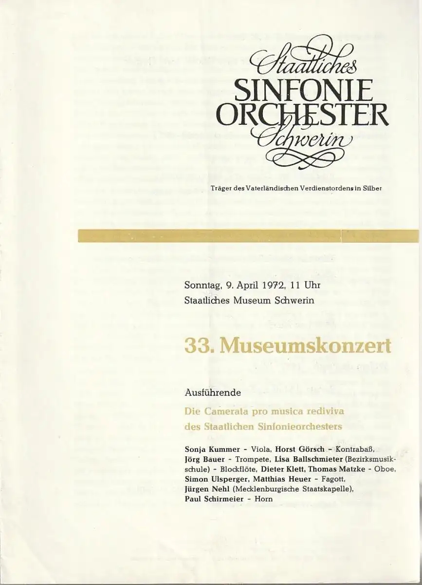Staatliches Sinfonieorchester Schwerin, Walter König, Klaus Rippke: Programmheft 33. MUSEUMSKONZERT 9. April 1972 Staatliches Museum Schwerin.