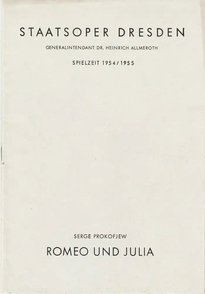 Staatsoper Dresden, Eberhard Sprink, Gudrun Rammler: Programmheft Erstaufführung in der Originalfassung Serge Segejewitsch Prokofjew ROMEO UND JULIA 16. Juni 1955 Spielzeit 1954 / 55 Heft Reihe B Nr. 1.