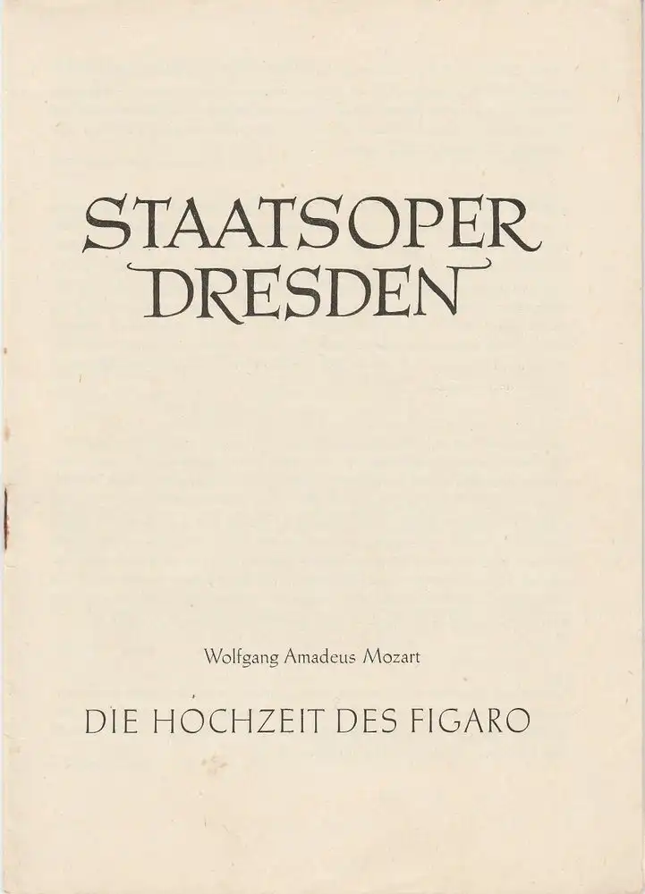 Opera buffa. Text nach Beau marchais' Lustspiel Le mariage de Figaro von Lorenzo da Ponte. Musikalische Leitung: Otmar Suitner. Inszenierung: Erich Geiger. Bühnenbild und Kostüme: Jochen Hasselwander. Chöre: Gerhart Wüstner. Choreographie: Tom Schilling. Mitwirkende: Hanns-Herbert Schulz, Ruth Glowa-Burkhardt, Eleonore Elstermann, Siegfried Vogel, Gisela Schröter, u. a. - Theaterprogramm, Opernprogramm, Ballettprogramm, Musicalprogramm, Konzertprogramm, Theatermemorabilia, Programmhefte Sammlung, deutsche Theatergeschichte.