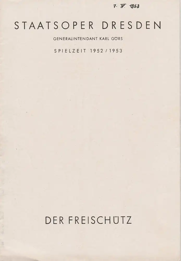 Staatsoper Dresden, Karl Görs, Günter Hauswald: Programmheft Carl Maria von Weber DER FREISCHÜTZ 7. April 1953 Großes Haus Spielzeit 1952 / 53 Heft Reihe A Nr. 1.