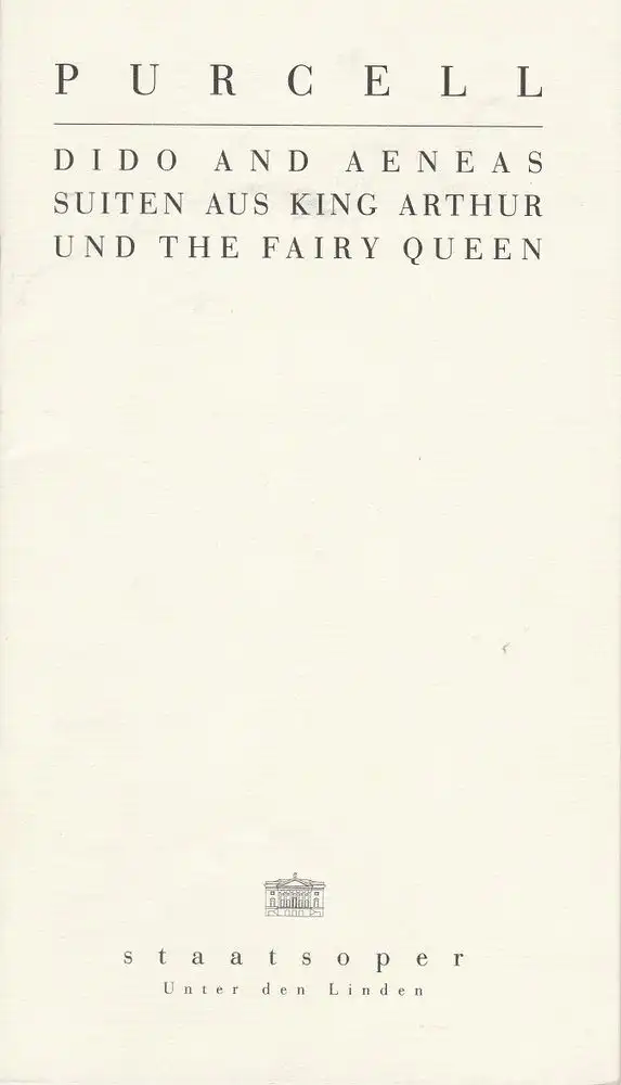 Konzert in Zusammenarbeit mit dem RIAS-Kammerchor Berlin. Dirigent: Marcus Creed RIAS-Kammerchor Concerto Köln. Solisten: Alison Browner, Russel Smythe, Susan Gritton, Jeffrey Francis, u. a.. Vortragsfolge: Suite aus KING ARTHUR: A dramatic opera. Libretto von John Dryden. Suite aus THE FAIRY QUEEN: English Opera. Text nach Shakespeares Midsummer Night's Dream. DIDO AND AENEAS: Libretto von Nahum Tate. Konzertante Aufführung in englischer Sprache. - Schlüsselwörter: Theaterprogramm, Opernprogramm, Ballettprogramm, Musicalprogramm, Konzertprogramm, Theatermemorabilia, Programmhefte Sammlung, deutsche Theatergeschichte.