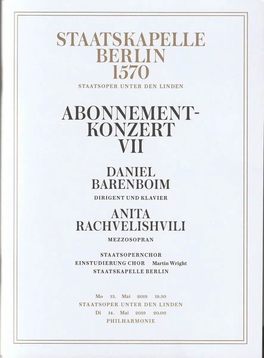 Staatsoper Unter den Linden, Matthias Schulz, Staatskapelle Berlin 1570, Daniel Barenboim, Jana Beckmann: Programmheft ABONNEMENTKONZERT VII 13. Mai 2019.