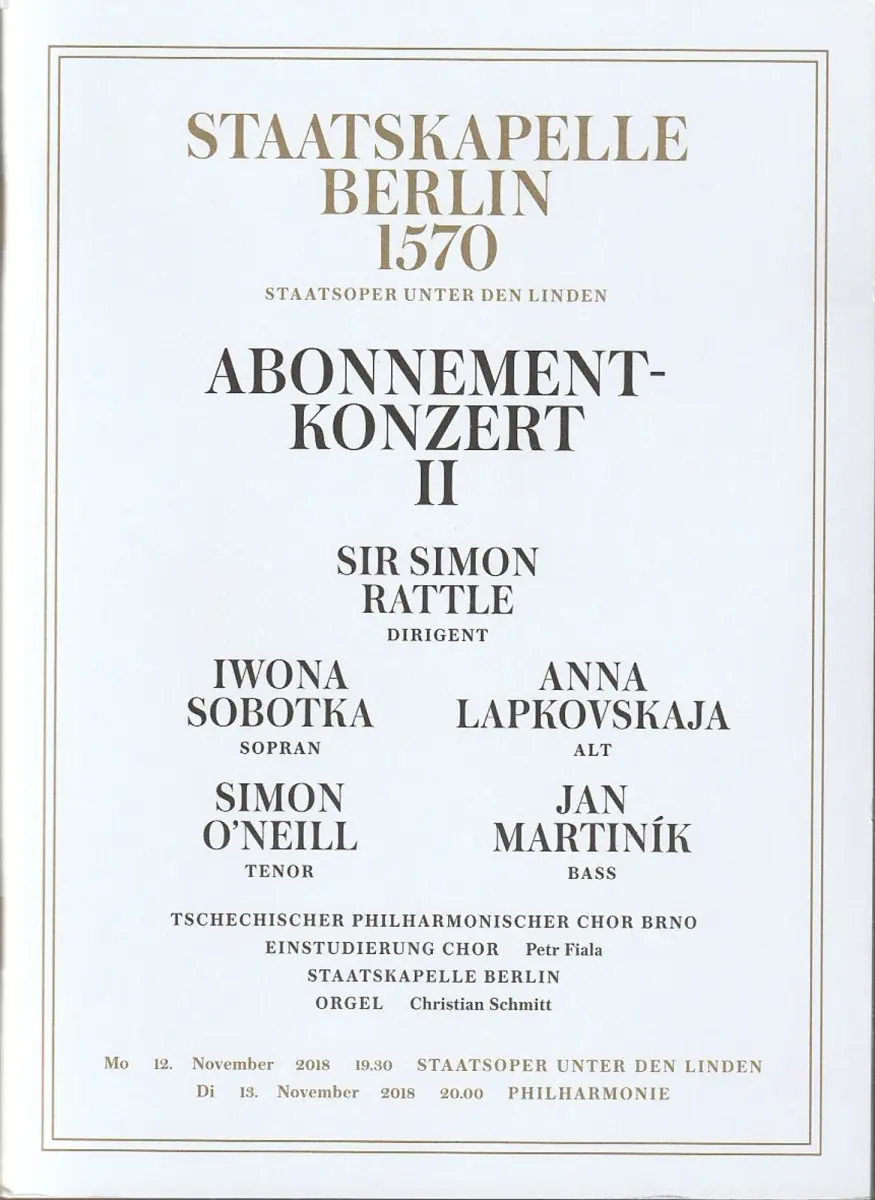 Dirigent: Sir Simon Rattle. Mitwirkende: Iwona Sobotka, Anna Lapkovskaja, Simon O'Neill, Jan Martinik. Programm: Giovanni Gabrieli: CANZON SEPTIMI ET OCTAVI TONI A 12 C H 182 / Joseph Haydn: Sinfonie Nr. 86 D-Dur HOB I:86 / Leos Janacek: Glagolistische Messe - Theaterprogramm, Opernprogramm, Ballettprogramm, Musicalprogramm, Konzertprogramm, Theatermemorabilia, Programmhefte Sammlung, deutsche Theatergeschichte.