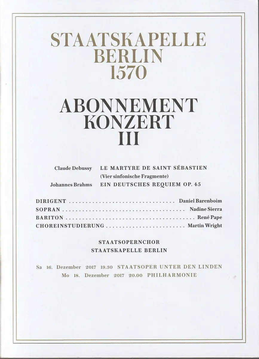 Dirigent: Daniel Barenboim. Mitwirkende: Nadine Sierra ( Sopran ), Michael Volle ( Bariton ) für Rene Pape. Programm: Claude Debussy: Le Martyre de Saint Sebastien - Das Martyrium des Heiligen Sebastian / Johannes Brahms: Ein Deutsches Requiem op. 45 - Theaterprogramm, Opernprogramm, Ballettprogramm, Musicalprogramm, Konzertprogramm, Theatermemorabilia, Programmhefte Sammlung, deutsche Theatergeschichte.