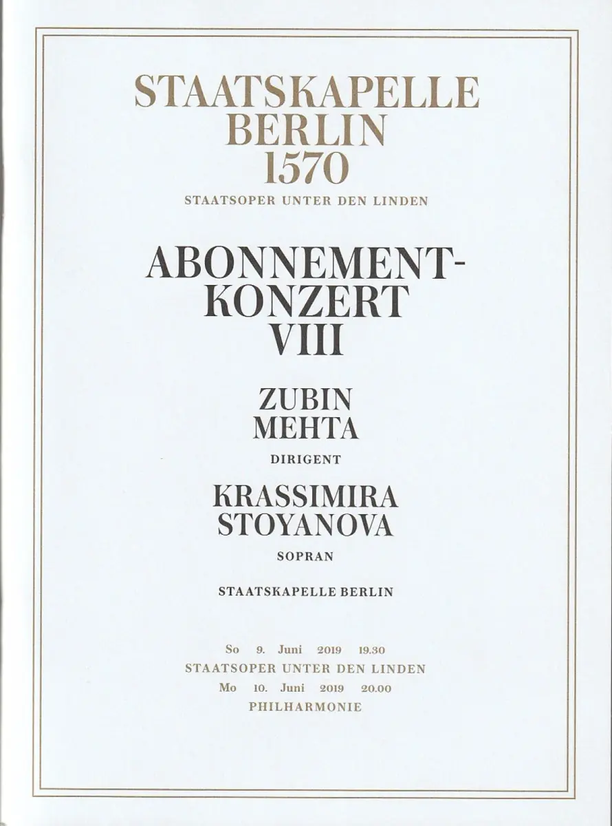Dirigent: Zubin Mehta. Mitwirkende: Krassimira Stoyanova, Sopran ( Ersatz laut Umbesetzungsbeilage: Lise Davidsen ). Programm: Richard Strauss: Vier letzte Lieder / Richard Strauss: Sinfonia Domestica op. 53 - Theaterprogramm, Opernprogramm, Ballettprogramm, Musicalprogramm, Konzertprogramm, Theatermemorabilia, Programmhefte Sammlung, deutsche Theatergeschichte.