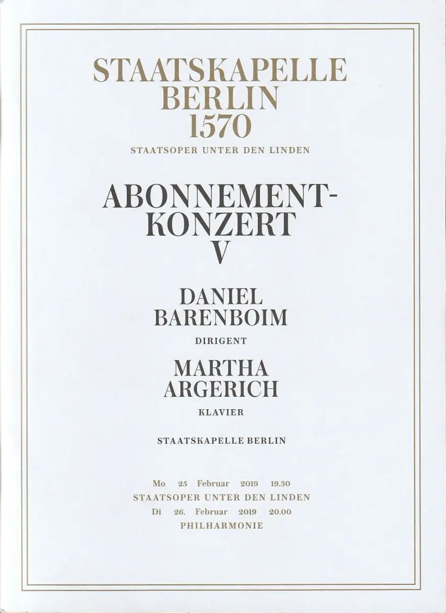 Staatsoper Unter den Linden, Staatskapelle Berlin 1570, Daniel Barenboim: Programmheft ABONNEMENTKONZERT V 25. Februar 2019.