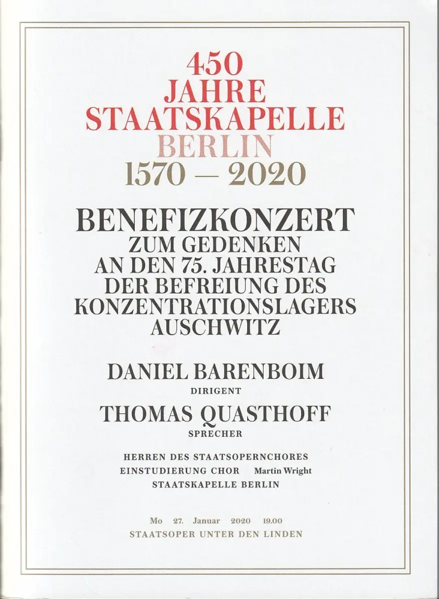 Staatsoper Unter den Linden, Staatskapelle Berlin 1570, Matthias Schulz, Daniel Barenboim, Detlef Giese: Programmheft BENEFIZKONZERT ZUM GEDENKEN AN DEN 75. JAHRESTAG DER BEFREIUNG DES KONZENTRATIONSLAGERS AUSCHWITZ 27. Januar 2020.