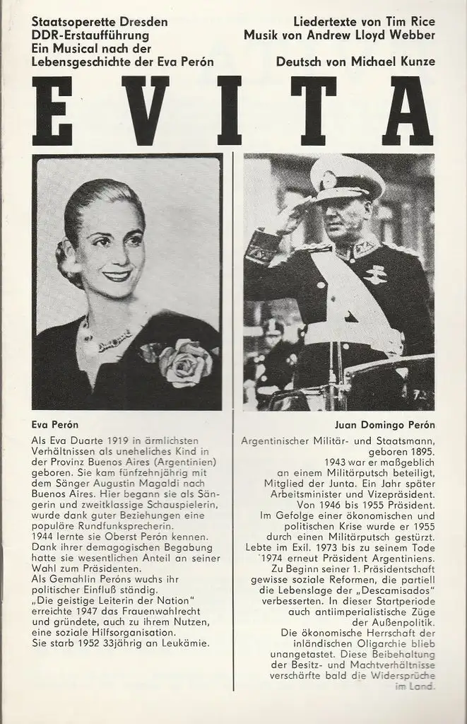 DDR-Erstaufführung. In Zusammenarbeit mit Robert Stigwood und David Land. Ein Musical nach der Lebensgeschichte von Eva Peron. Liedertexte: Tim Rice. Musikalische Leitung: Volker Münch. Inszenierung: Walter Niklaus. Choreographie: Eva Reinthaller. Bühne: Bernd Leistner. Kostüme: Christa Hahn. Mitwirkende: Cornelia Drese / Bettina Weichert, Thomas Georgi / Gottfried Richter, Hans Großer, Steffen Friedrich / Jürgen Mutze, Christiane Hilber / Carmen Weber, u. a. - Theaterprogramm, Opernprogramm, Ballettprogramm, Musicalprogramm, Konzertprogramm, Theatermemorabilia, Programmhefte Sammlung, deutsche Theatergeschichte.