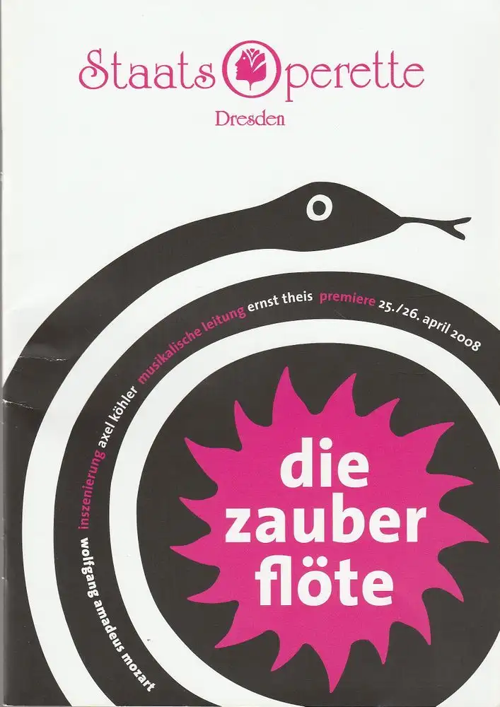 Eine große Oper. Musik: Wolfgang Amadeus Mozart KV 620. Text von Emanuel Schikaneder. Musikalische Leitung: Ernst Theis. Inszenierung: Axel Köhler. Bühne: Hartmut Schörghofer. Kostüme: Corinna Crome. Mitwirkende: Jessica Glatte / Silvia Weiss, Marc Horus / Ralf Simon, Herbert G. Adami / Alexander Vassiliev, Antje Bitterlich / Yoo-Ra Lee-Hoff, Christian Grygas, Gerd Wiemer, Svea Johnsen / Jeanette Oswald, Bernd Könnes / Frank Oberüber, Elke Kottmair / Ingeborg Schöpf, u.a. - Theaterprogramm, Opernprogramm, Ballettprogramm, Musicalprogramm, Konzertprogramm, Theatermemorabilia, Programmhefte Sammlung, deutsche Theatergeschichte.