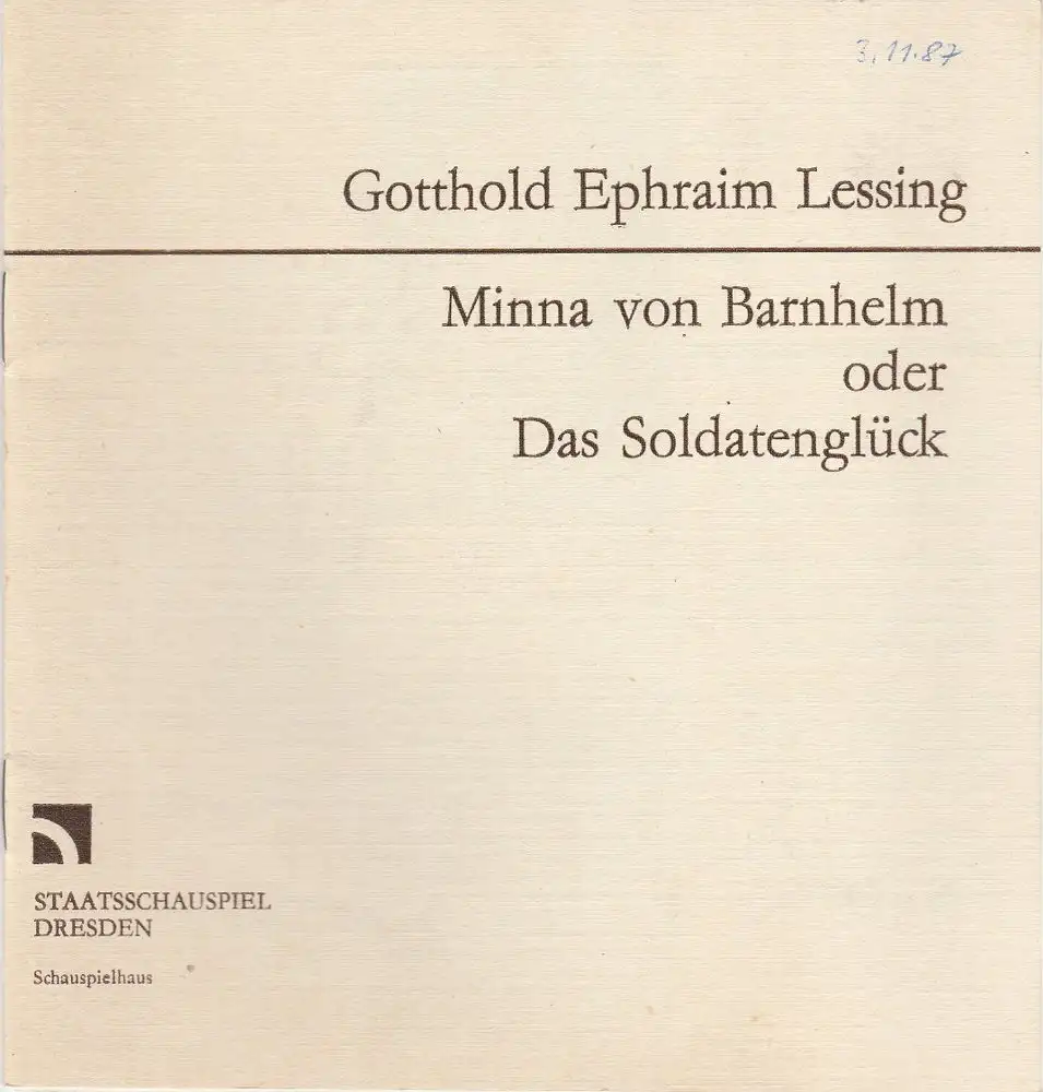 oder Das Soldatenglück. Ein Lustspiel von Gotthold Ephraim Lessing. Regie: Horst Schönemann. Bühne und Kostüme: Volker Walther. Mitwirkende: Hanns-Jörn Weber, Regina Jeske, Vera Irrgang, Rudolf Donath, Joachim Nimtz, Friedrich Siebert, Gerlinde Schulze, Alfred Lübke, Karl-Heinz Rosemann, Matthias Henkel - Theaterprogramm, Opernprogramm, Ballettprogramm, Musicalprogramm, Konzertprogramm, Theatermemorabilia, Programmhefte Sammlung, deutsche Theatergeschichte.